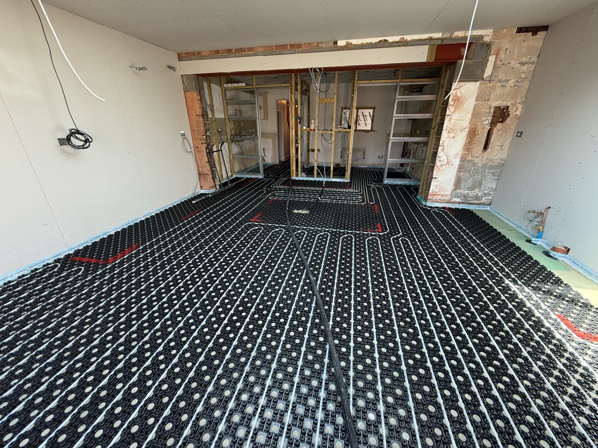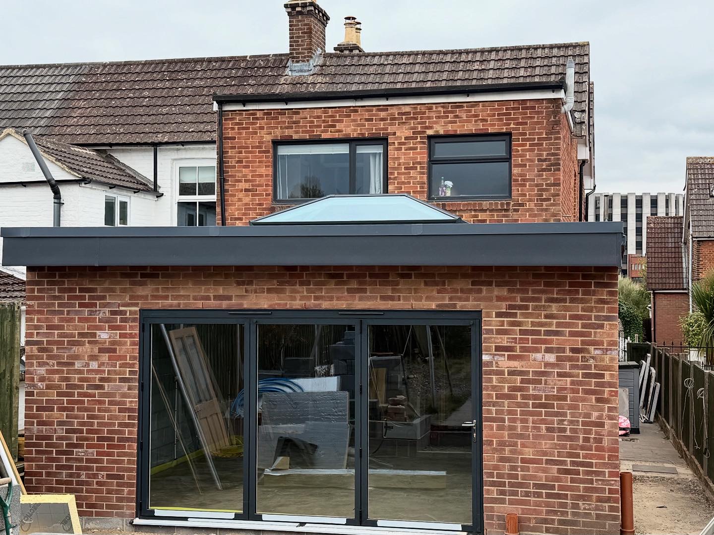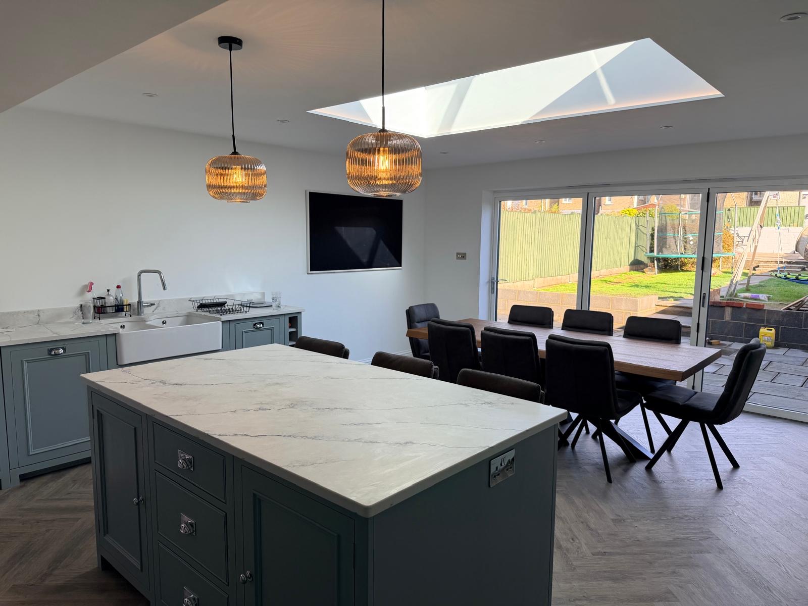 This kitchen extension was completed to create a larger, more practical living space, incorporating a utility area and a seperate shower room. A roof lantern was installed to maximise natural light, while underfloor heating was fitted throughout to provide an efficient and comfortable finish.